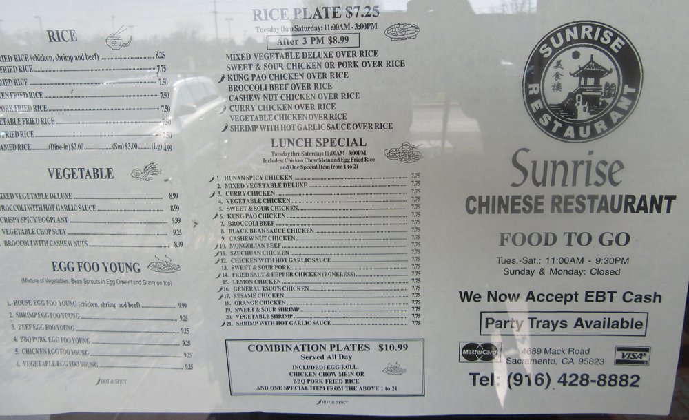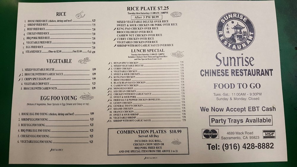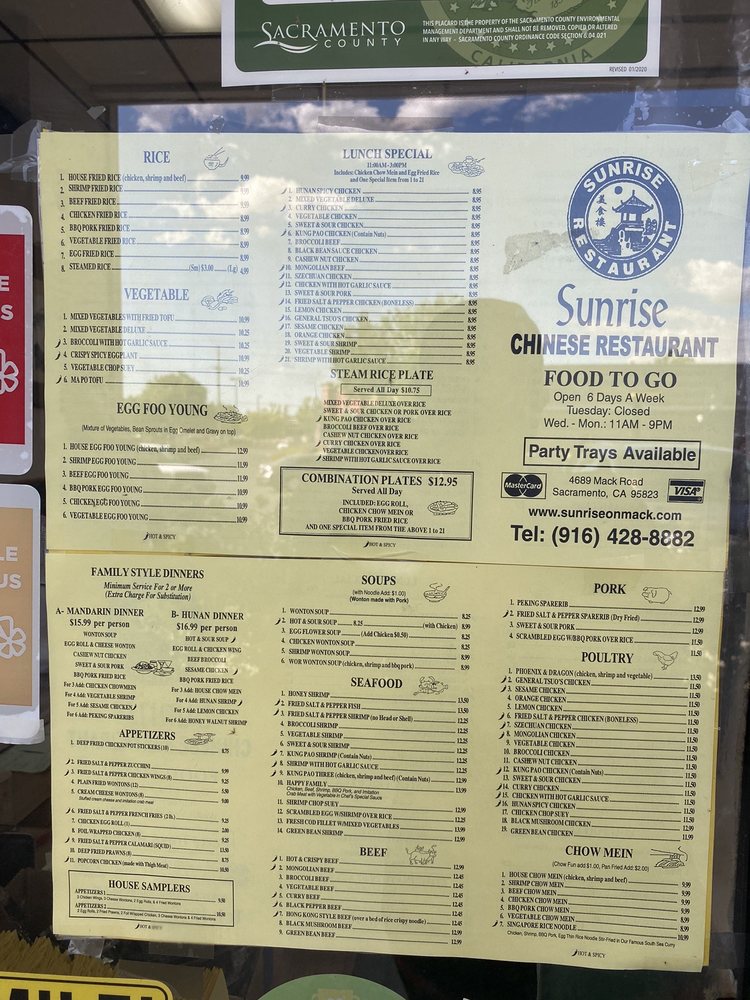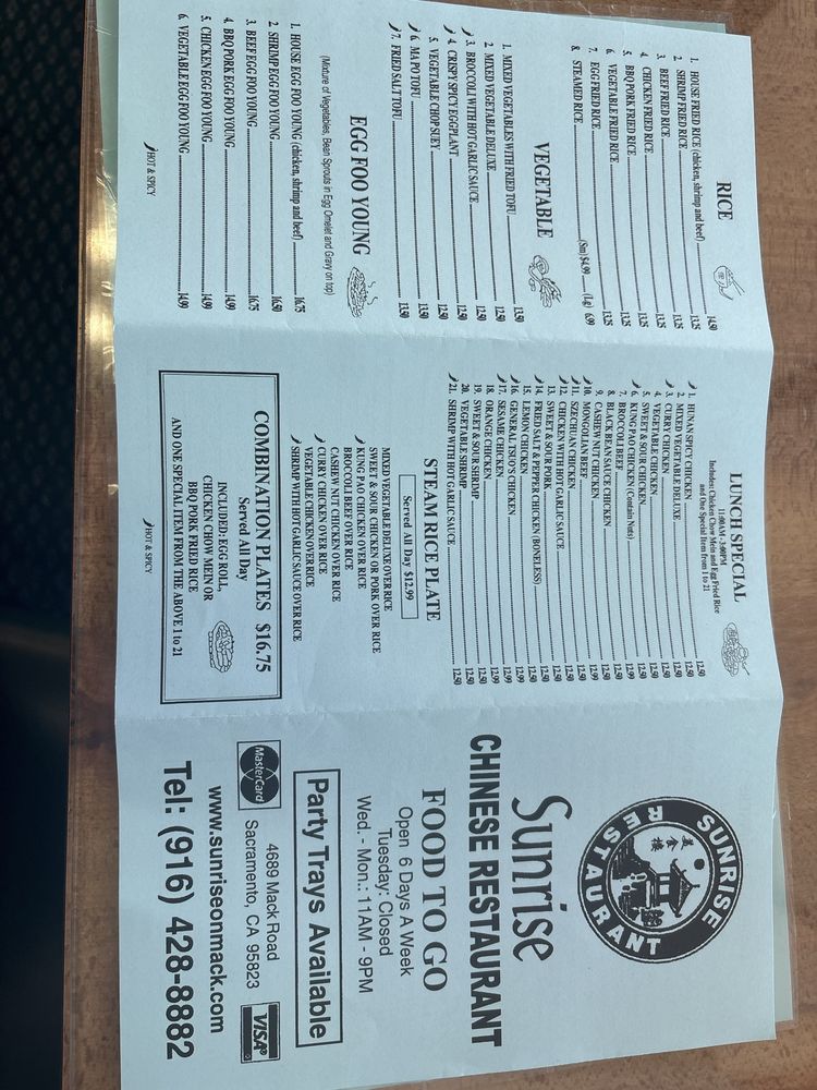 Sunrise Chinese Restaurant, located in Sacramento, offers a wide array of Chinese dishes with many vegetarian options. This casual restaurant, known for its big portions and tasty food, provides delivery and takeout services. Customers praise the consistent quality, taste, and value of the menu items. The beef broccoli, BBQ pork fried rice, chicken chow mein, BBQ pork pan fried noodles, mushroom chicken, stir-fried veggies, and cream cheese wontons are highly recommended. Despite only offering takeout and delivery, the food is always tasty, service is fast, and the staff is friendly. While some customers have mentioned issues with service, the majority agree that Sunrise Chinese Restaurant is a must-try for delicious Chinese cuisine in Sacramento.